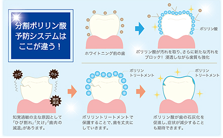 ポリリン酸ホワイトニングは、このポリリン酸ナトリウムを使って、歯の汚れを落とし、コーティング(ステインや歯石の沈着防止)するため、痛みもなく、着色しにくく、透明感も残ります。